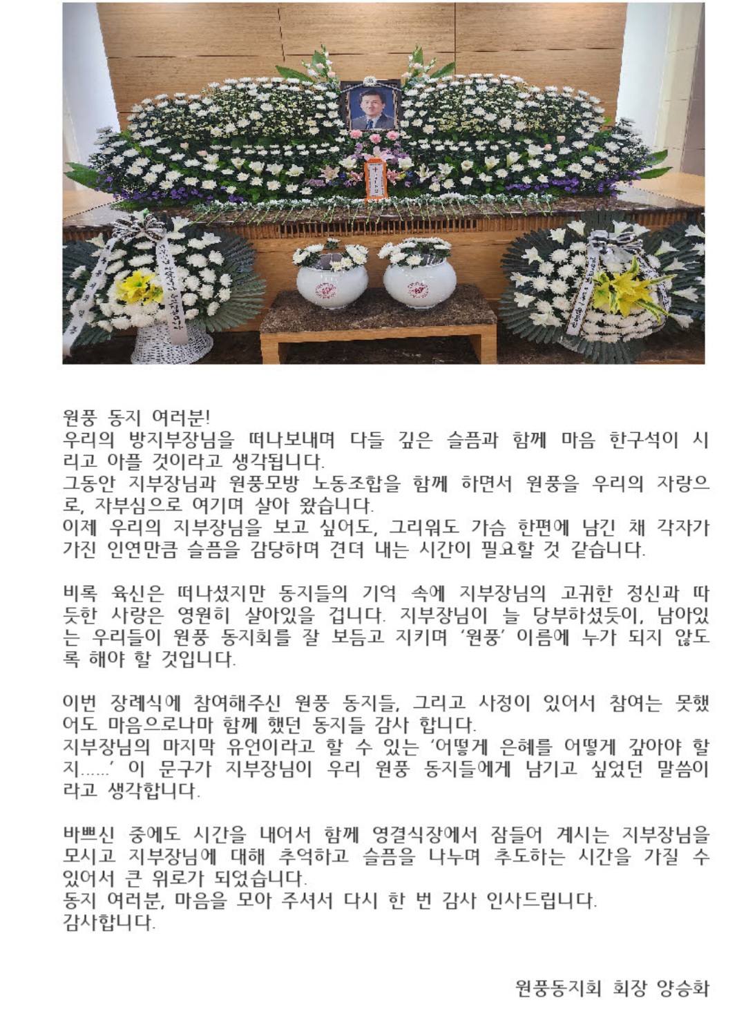 ¿À´Ã ¿øÇ³µ¿Áöȸ(¿øÇ³³ëÁ¶ÇذíÀÚ¸ðÀÓ)´Â ¹Ý¼¼±â¸¦ ³Ñ¾î ÇÔ²²Çؿ ¼ÒÁßÇÑ ¼±¹èÀÌ¸ç µ¿ÁöÀÎ, ¹æ¿ë¼® ÁöºÎÀå´ÔÀ» ¶°³ª º¸³À´Ï´Ù. Åõº´ Áß ¼öÂ÷ °íºñ¸¦ ³Ñ±ä ÇßÀ¸³ª ºÒ½Ã¿¡ ´ÚÄ£ ¸¶Áö¸· À̺°Àº ¾ß¼ÓÇϰí Ȳ¸ÁÇϱ⸸ ÇÕ´Ï´Ù. ±¹È¸ÀÇ¿ø, Àå°ü, °ø±â¾÷ÀÇ ´ëÇ¥ µî »çȸÀû ȣĪÀÌ ¸¹Áö¸¸, ¿ì¸® '¿øÇ³µ¿Áöȸ'´Â ÀÚ³àµéÁ¶Â÷µµ '¹æ ÁöºÎÀå´Ô'¶ó°í ÀλçÇÏ´Â ±× ȣĪ ±×´ë·Î ¿µ¿øÈ÷ '¹æ ÁöºÎÀå´Ô'À¸·Î ³²À» °ÍÀÔ´Ï´Ù.