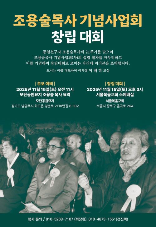 Á¶¿ë¼ú ¸ñ»ç ±â³ä»ç¾÷ȸ °ü°èÀÚ´Â "⸳´ëȸ´Â Á¶ ¸ñ»ç´ÔÀÌ Æò»ý ²Þ²Ù¼Ì´ø 'Æòȷοî Çѹݵµ'¸¦ ÇâÇÑ ¿ì¸® ¸ðµÎÀÇ ÀÇÁö¸¦ »õ·Ó°Ô ´ÙÁüÇÏ´Â ÀÚ¸®°¡ µÉ °Í"À̶ó¸ç, "ÀÌÀç¸í Á¤ºÎÀÇ ÆòÈ ³ë·Â¿¡ ÈûÀ» ´õÇϰí, ¹ÎÁ· ÈÇØÀÇ Á¤½ÅÀ» ³Î¸® ÆÛ¶ß¸®´Â µ¥ ±â¿©ÇÒ ¼ö Àֱ⸦ Èñ¸ÁÇÑ´Ù"°í ¹àÇû´Ù. 11¿ù 15ÀÏ(Åä) 11½Ã ¸ð¶õ°ø¿ø¹¦Áö Á¶¿ë¼ú ¸ñ»ç ¹¦¿ª(°æ±âµµ ³²¾çÁֽà ȵµÀ¾ °æÃá·Î 2110¹ø±æ 8-102)¸¦ Âü¹èÇÑ ÈÄ Ã¢¸³ ´ëȸ´Â ¿ÀÈÄ 3½Ã Á¾·Î ¼¿ïº¹À½±³È¸¼ »ç)Çѱ¹±âµ¶±³¹ÎÁÖȿ ÈÄ¿øÀ¸·Î ¿¸°´Ù. Çà»ç ¹®ÀÇ: 010-5268-7107(ÃÖ´çÇö) 010-4873-1551(ÀüÁøÅÃ)