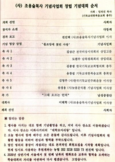 Á¶¿ë¼ú ¸ñ»ç ±â³ä»ç¾÷ȸ´Â »çÈÄ ½Ã°£ÀÌ ¸¹ÀÌ °¬Áö¸¸ ÀÛÁö¸¸ NCCȸ¿ø±³´ÜÀÎ º¹À½±³´ÜÀ¸·Î½áµµ Áß¿äÇÑ ÁöµµÀÚ·Î ÇÑ »ç¶÷¿¡ ´ëÇÑ ±â³äÀ» ³Ñ¾î ±³´ÜÀûÀ¸·Î Å« Àǹ̰¡ Àֱ⠶§¹®ÀÌ´Ù. ½Ã¹«ÇϽôø ±º»êº¹À½±³È¸ Çö ´ãÀÓÀÎ ÀüÁøÅøñ»ç¸¦ À§½ÃÇÏ¿© Áøº¸ Áø¿µÀÇ ±×¸¦ ±â¾ïÇÏ´Â ºÐµéÀÇ ¶æÀÌ ¸ð¾È Áø °ÍÀ¸·Î º¸ÀδÙ. ±â³ä»ç¾÷ȸ´Â °íÀÎÀÇ Á¤½ÅÀ» °è½ÂÇÏ¿© ³Ã·©ÇØÁø ³²ºÏ °ü°è¿¡ µû¶æÇÑ ÈÆÇ³À» ºÒ¾î³Ö°í, ¹Î°£ Â÷¿øÀÇ ±³·ù¿Í Çù·ÂÀ» À§ÇÑ »õ·Î¿î ¹°²¿¸¦ Æ®´Â ¿ªÇÒÀ» ¼öÇàÇÒ °ÍÀ¸·Î ±â´ëµÈ´Ù.