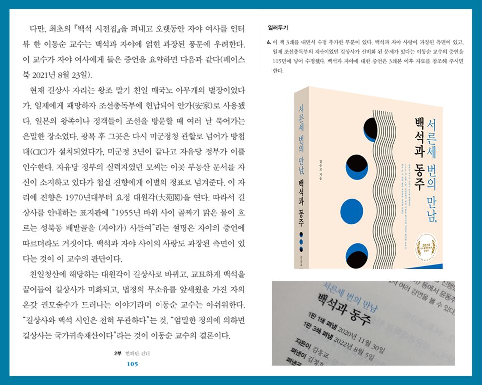 À̵¿¼ø ±³¼ö´ÔÀÇ °ËÅ並 ¹Þ°í 3¼âº»¿¡¼ ¹é¼®°ú ÀÚ¾ß »çÀÌÀÇ °ü°è¿¡¼ È®½ÇÇÑ Áõ°Å°¡ ¾ø´Â ³»¿ëÀ» »õ·Î¿î »ç½Ç·Î ´ëüÇß½À´Ï´Ù. ´Ã ¹Ù¸¥ Á¤º¸¸¦ Áֽô À̵¿¼ø ±³¼ö´Ô²² °¨»çµå¸³´Ï´Ù. 3¼â¸¦ ³»¸é¼ <ÀÏ·¯µÎ±â>¿¡ 105¸éÀ» »õ·Î¿î ³»¿ëÀ¸·Î ¹Ù²Ù¾î ³Ö¾ú´Ù°í ½á³õ¾Ò½À´Ï´Ù. 1,2¼âº»À» ±¸ÀÔÇØÁֽŠºÐ, ±×·¸´Ù°í 105¸é¿¡ ½Ç¸° ³»¿ëÀÌ Æ²¸®´Ù´Â ¶æÀº ¾Æ´Õ´Ï´Ù. ´õ Áß¿äÇÑ ³»¿ëÀ¸·Î ¹Ù²Ù¾ú´Ù´Â ¾Ë¸²ÀÔ´Ï´Ù. 105¸éÀÇ ³»¿ëÀº ¾Æ·¡ ÷ºÎÇÑ »çÁø°ú ÇÔ²² ÀоîÁÖ½Ã¸é °¨»çÇϰڽÀ´Ï´Ù. Ã¥À» ³»°íµµ ±ÍÂú°Ô ¼öÁ¤ÇÏ´Â ÀúÀÚ¸¦ ¿ÀÈ÷·Á ¹Ý°©°Ô ¹Þ¾ÆÁֽô ¾ÆÄ«³Ý ÆíÁýºÎ¿¡ °¨»çµå¸³´Ï´Ù |