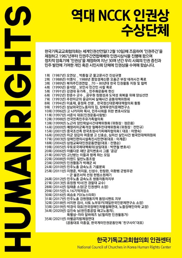 Çѱ¹±âµ¶±³±³È¸ÇùÀÇȸ(NCCK) ÀαÇÀ§¿øÈ¸´Â 1970³â´ë À¯½Å ±º»çÁ¤±Ç ½ÃÀý ±¹°¡Æø·ÂÀÇ ½Ç»óÀ» µå·¯³½ ÀαÇź¾Ð¿¡ ¸Â¼ ½Î¿ü´ø ¼ÒÁßÇÑ ¿ª»çÀû ÀÚ»êÀÌ´Ù. ÃÊ´ë ÀαÇÀ§¿øÀå Á¶³²±â ¸ñ»ç¸¦ ¸ð½Ã°í Ȱµ¿Çß´ø ÇÊÀÚ´Â ÀαÇÀ§ÀÇ ¿ªÇÒ°ú Àǹ̸¦ ´©±¸º¸´Ù ±àÁ¤ÀûÀ¸·Î Æò°¡ÇÏ¸ç ±× ¿ªÇÒ¿¡ ¾ÖÁ¤À» °®°í Àֱ⿡ À̹ø ¹®Á¦ Á¦±â´Â »ç¶÷À̳ª Ȱµ¿ Àüü°¡ ¾Æ´Ï¶ó ¿ÃÇØ ¼ö»óÀÚ¿¡ ´ëÇÑ ´Ù¸¥ ½Ã¼±À¸·Î º¸ÀÚ´Â °ø°³ Á¦¾ðÀÓÀ» ¸ÕÀú ¹àÈù´Ù.